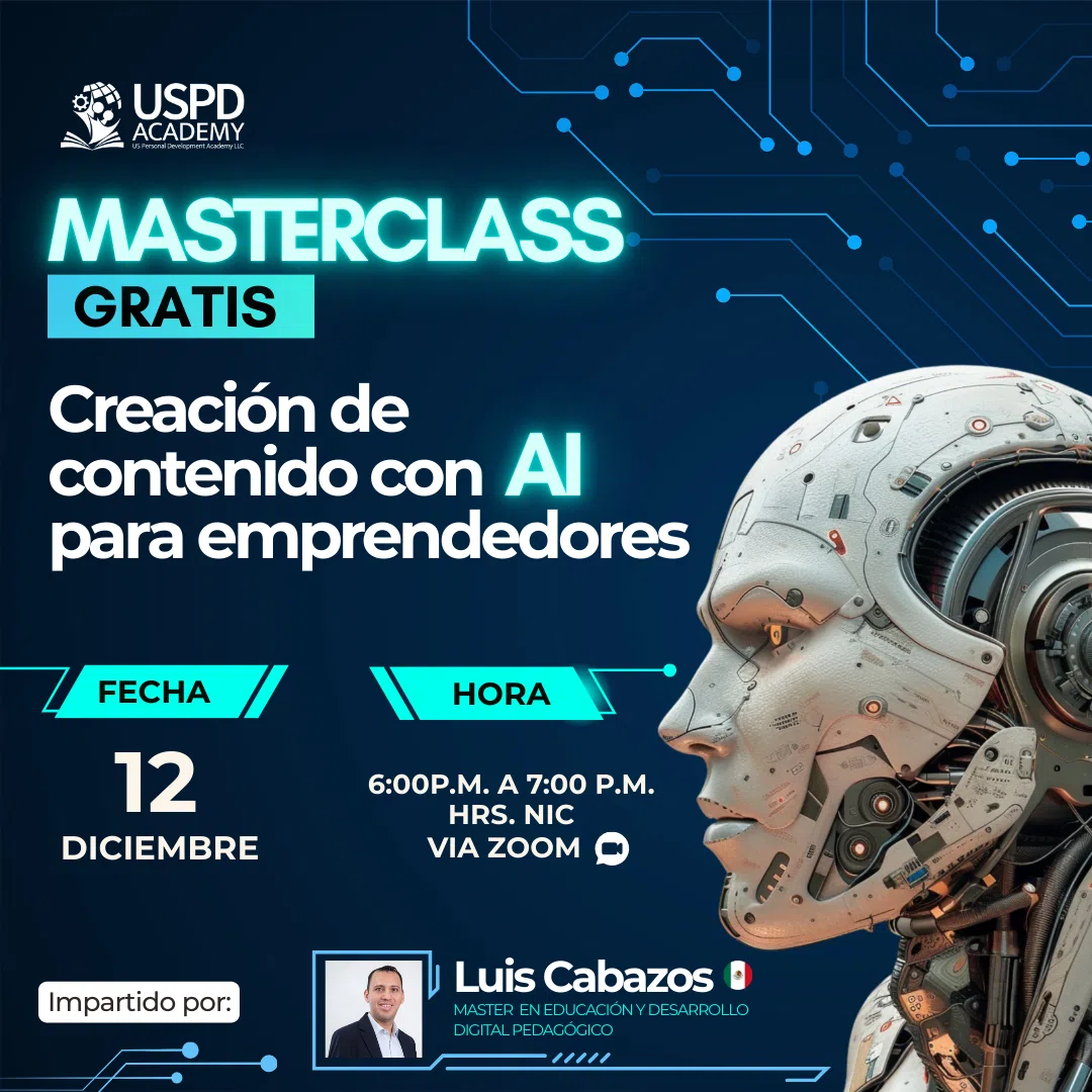 La inteligencia artificial se ha convertido en la herramienta definitiva para quienes desean impulsar su marca, optimizar su tiempo y crear contenido más profesional sin complicaciones. En esta Masterclass gratuita, el especialista Luis Cabazos, Máster en Educación y Desarrollo Digital Pedagógico, te mostrará paso a paso cómo aprovechar el poder de la IA para transformar tus ideas en contenido atractivo, estratégico y diseñado para conectar con tu audiencia.